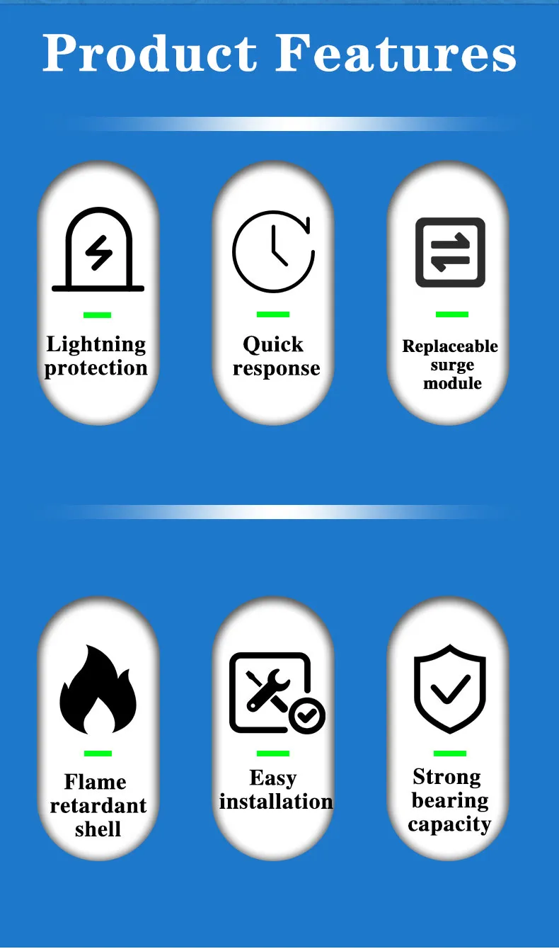 Surge -salaman pidättäjamme voivat tehokkaasti suojata aurinkoenergiajärjestelmissä elektronisia laitteita salamakkojen, ruudukkojen vaihtelun tai sähköstaattisen purkauksen aiheuttamilta jännitekohdilta. Tämäntyyppinen suoja on erittäin hyödyllinen avainkomponenttien, kuten inverttereiden ja valvontalaitteiden turvalliselle toiminnalle.